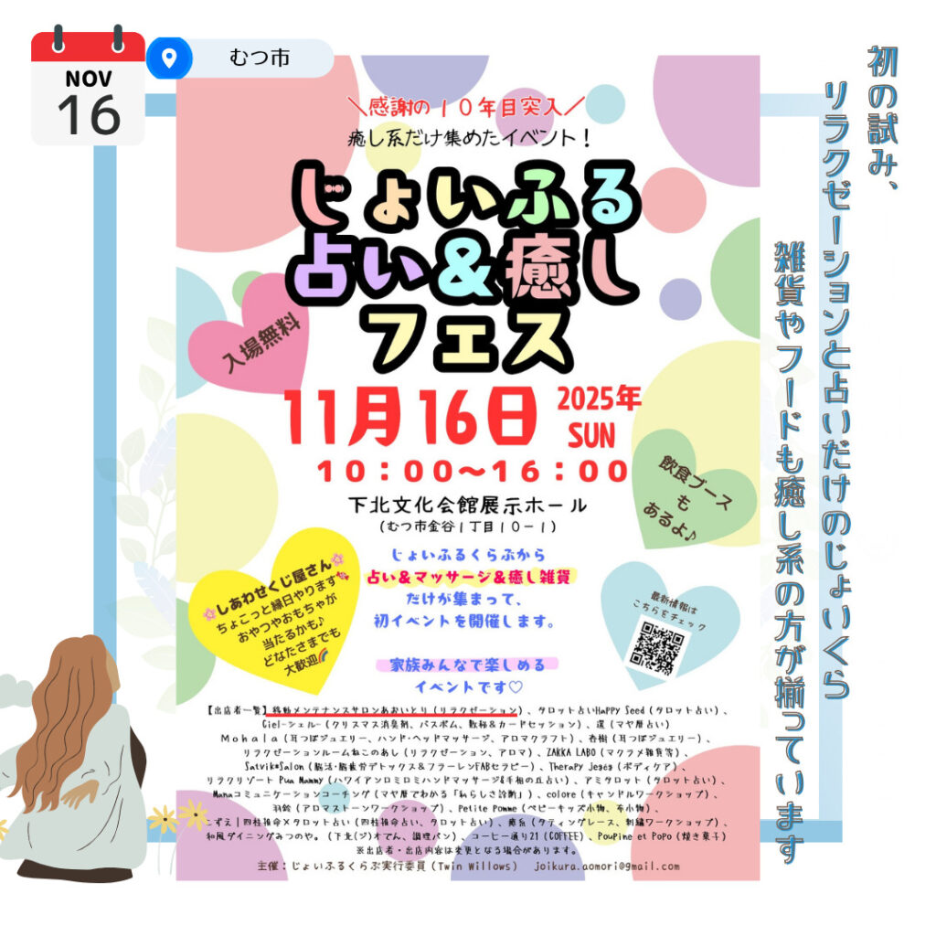 じょいくら初の試みで占いとリラクゼーション、癒し雑貨+フードが集まったイベントです。