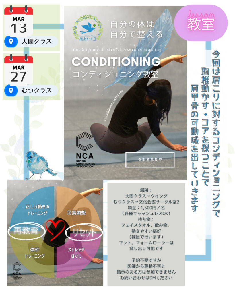 例えば3月は肩こりに着目したセルフコンディショニングを行います。